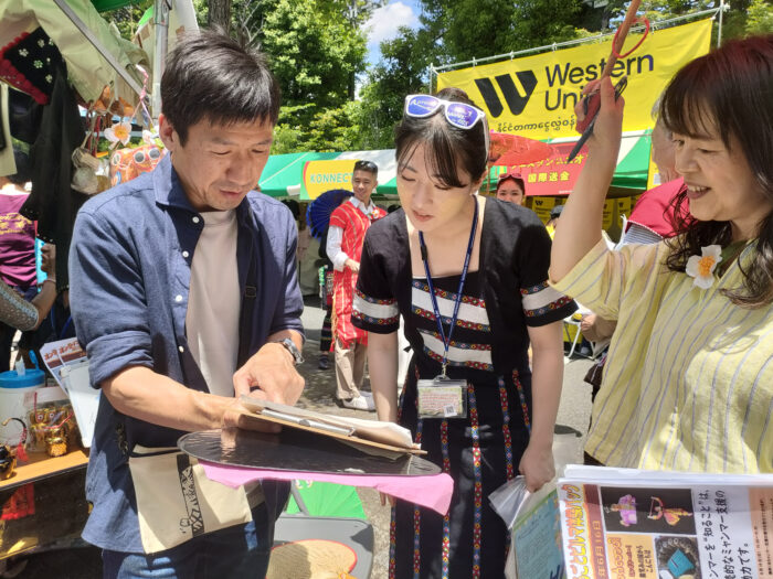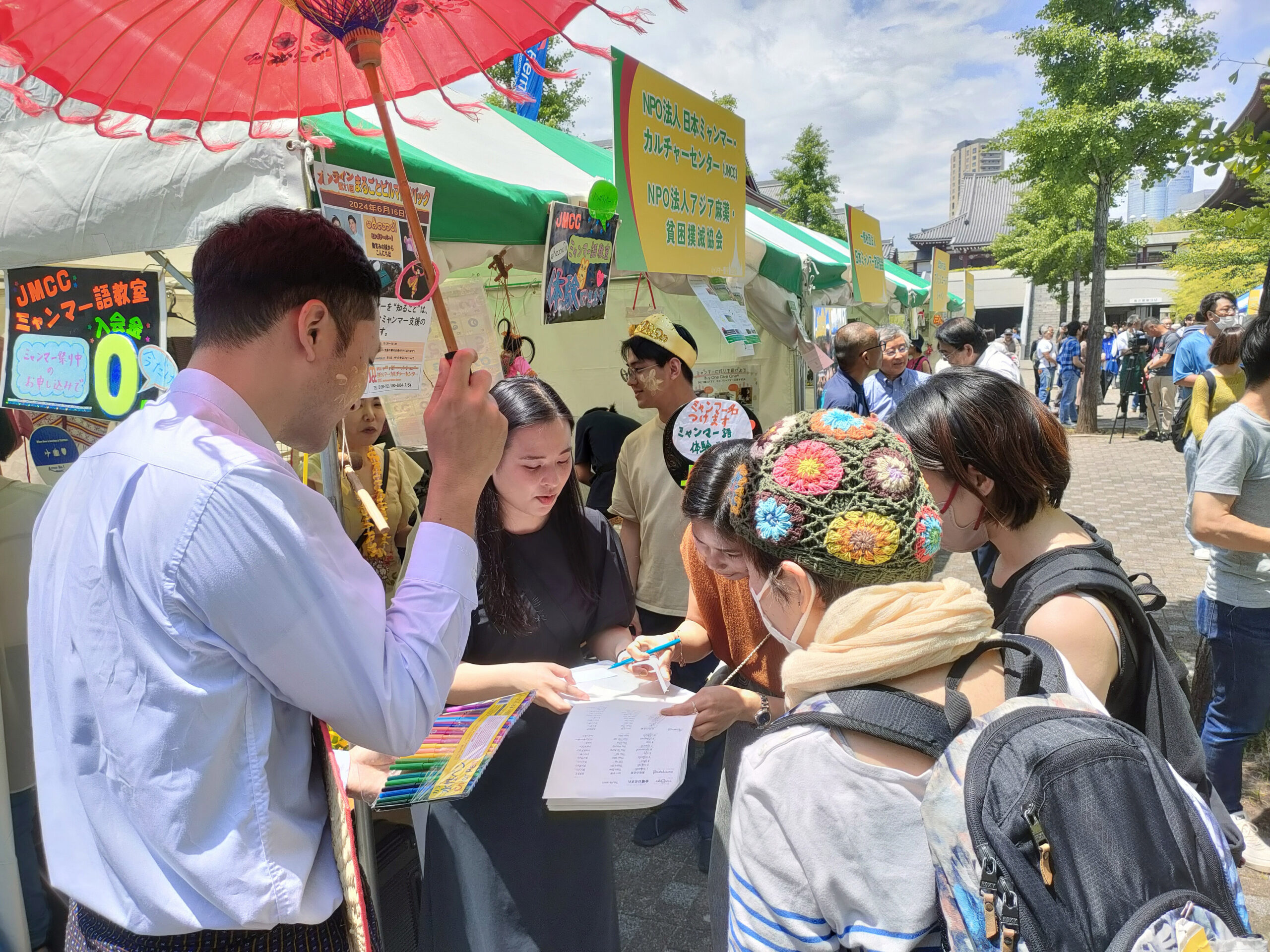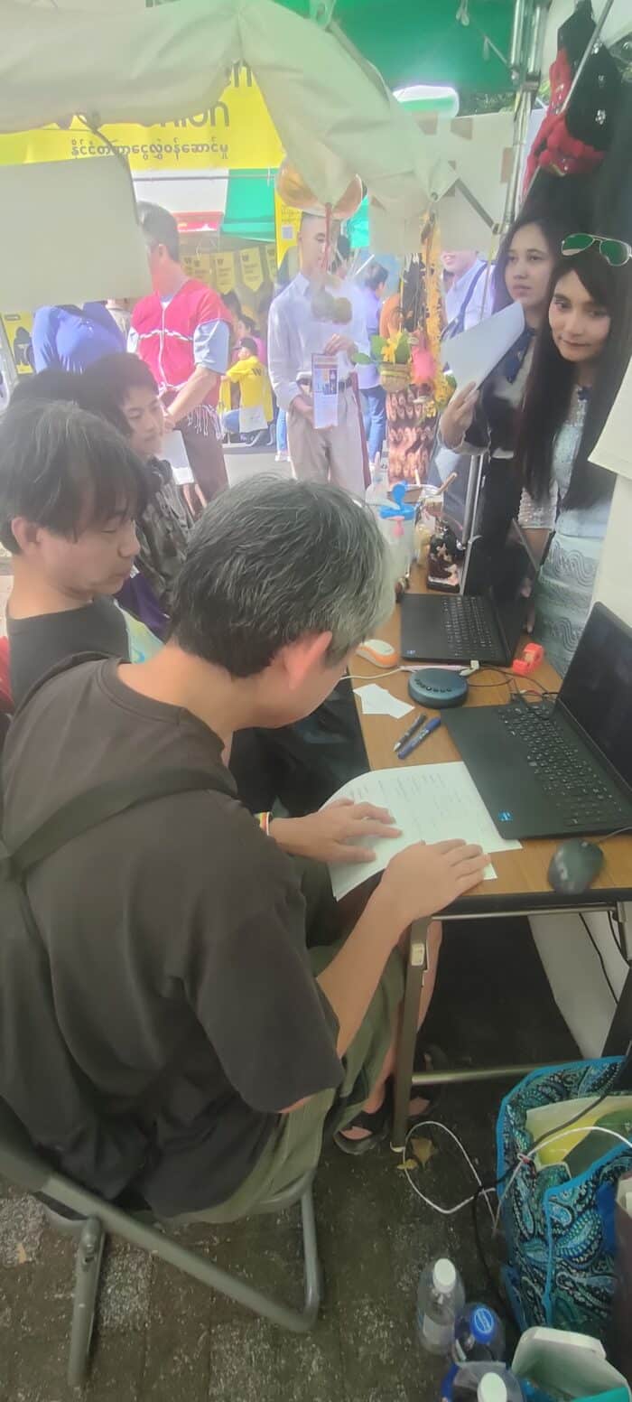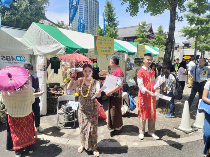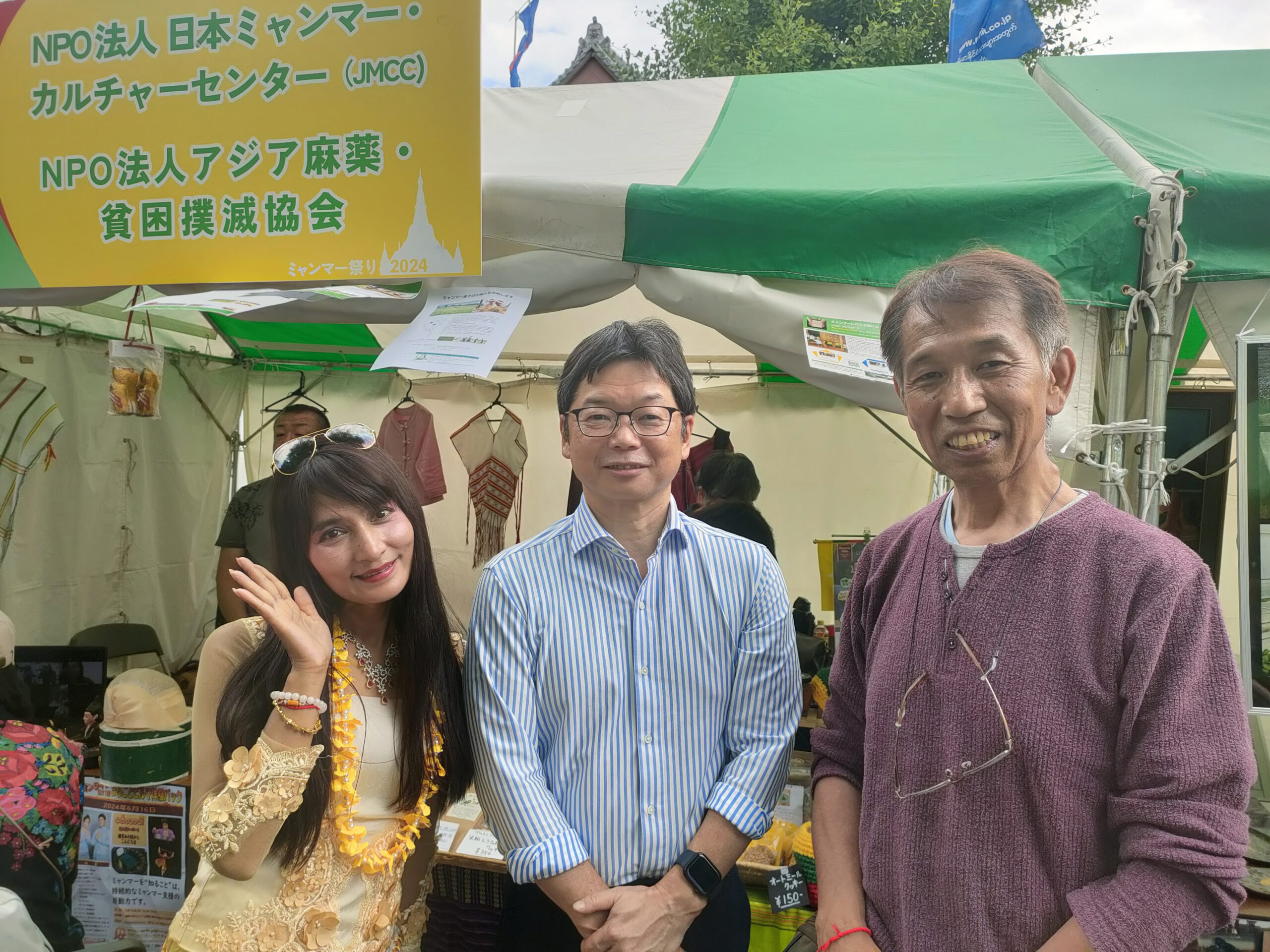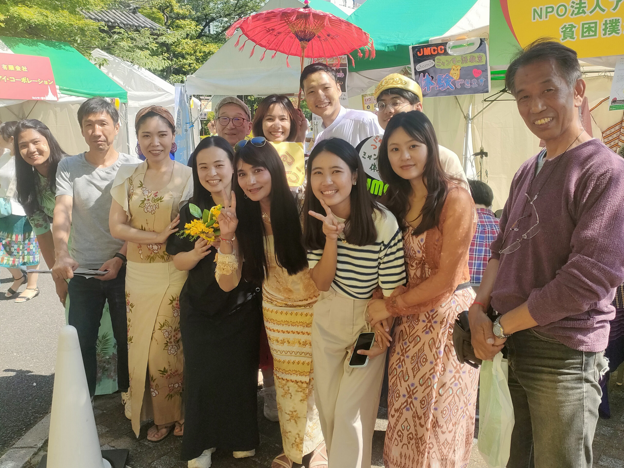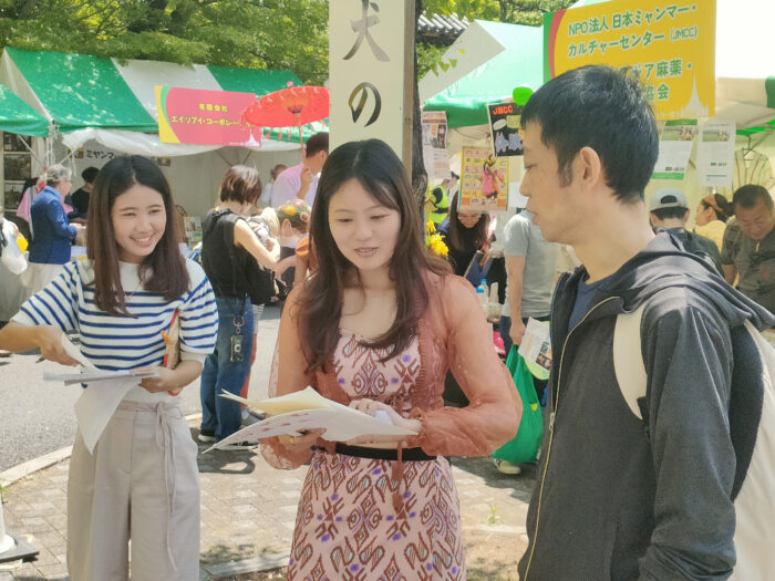5月25日(日)~26日(月)ミャンマー祭りに参加 2024年5月25日(日)~26日(月)ミャンマー祭りに参加 例年通り、NPO法人アジア麻薬・貧困撲滅協会とブースを分け合って、ミャンマー祭りに参加。しました。ミャンマー人と日本人(ミャンマー語教室の生徒さん、日本語教室・子ども会の先生たち、JMCCと何らかの形で関わってくださった方々などなど)が協力して、ミャンマー語体験レッスン、ミャンマー名命名、伝統格闘技ラウェイ日本人チャンピオンのお話、タナカ体験、竪琴と写真撮影など、いろいろな企画を来場者に提供して楽しんでいただくことができました。 5月25日(日) 5月26日(月)
